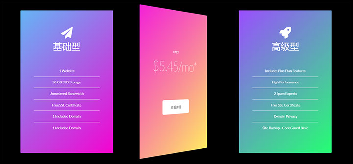 css3产品展示卡片布局翻转特效,一款样式精美的云服务器介绍展示布局效果,鼠标悬停卡片翻转查看更多信息。