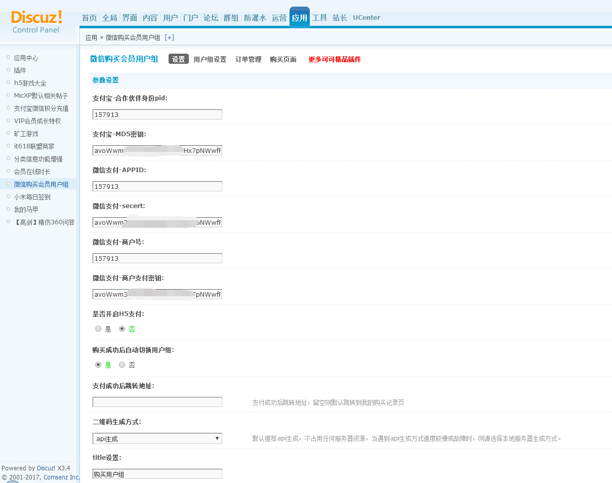 2.修改discuz后台中的应用-微信购买用户组中的支付宝ID信息以及微信ID信息
