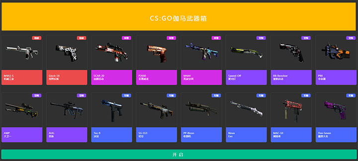 js游戏武器装备随机抽奖代码,点击开启按钮开始抽奖,随机抽取并弹出中奖结果。这个奖品可以自定义换成任意奖品。