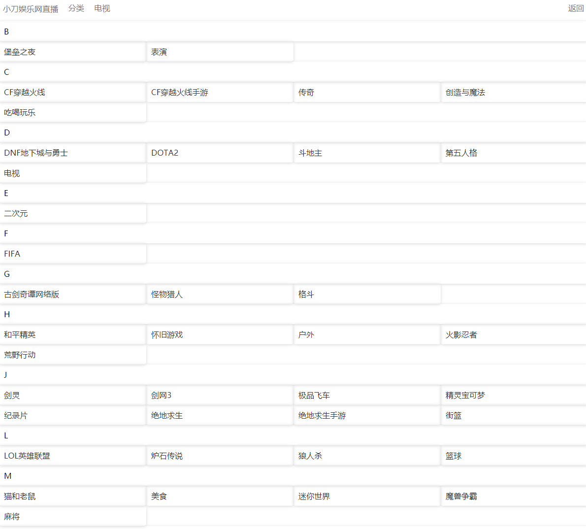 将斗鱼、虎牙、触手、YY、龙珠、战旗、章鱼、电视直播按分类/关键词聚合,用户选择分类,可以观看到全网该关键词下正在直播的内容。