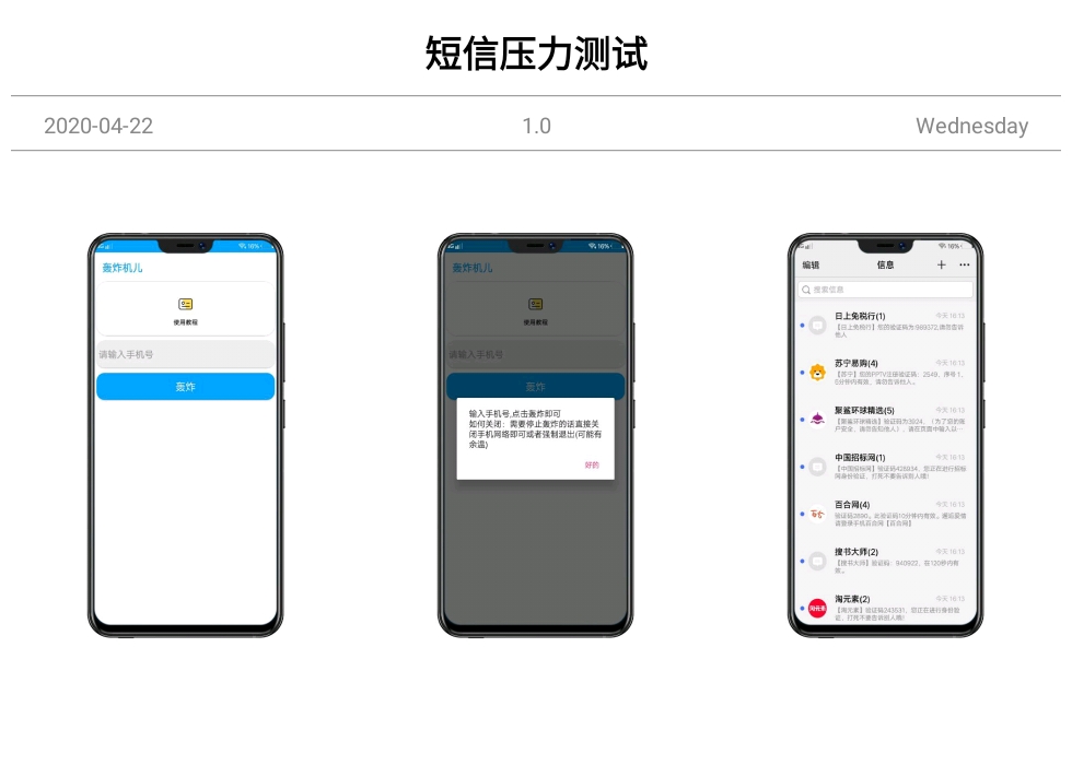 【安卓软件】短信压力测试 —— 恶搞朋友搞pian子必备,使用简单只需输入手机号码即可,一秒几十条短信!实用给力!猛的一批!(接口问题部分手机可能比较慢)