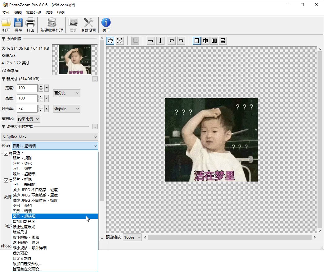 PhotoZoom 是一款使用了革命性技术、效果最好的图片无损放大软件。利用它可以对图片进行放大而没有锯齿,不会失真,让您享受无与伦比的完美放大图像质量效果。PhotoZoom 使用了S-Spline Max增强算法、增强了图片格式支持、支持多处理器、GPU加速等。这种算法是一种拥有自动调节、高级插值算法的专利技术,可以尽可能地提高图片放大或缩小时的品质,对图片放大或缩小而没有锯齿、较少失真。使用很简单,打开图片后,默认是 S-Spline Max,首先选择「更改大小的方式」,就会自动调整图片。