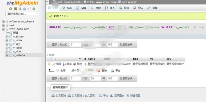 4.使用phpMyAdmin打开数据库文件,修改v_website表的site字段为你的网址。