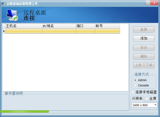 可批量添加主机IP端口和账号密码,支持一键连接、设置分辨率和连接方式;