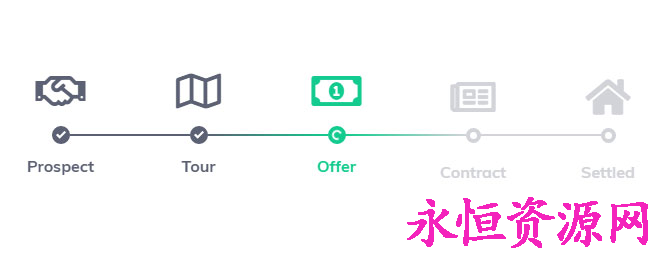 一款好看的CSS3 SVG房屋交易步骤流程图样式特效,合作、签署、付款、填写、交付房屋购买五步骤布局样式代码。支持类似开关灯效果的黑白背景切换。