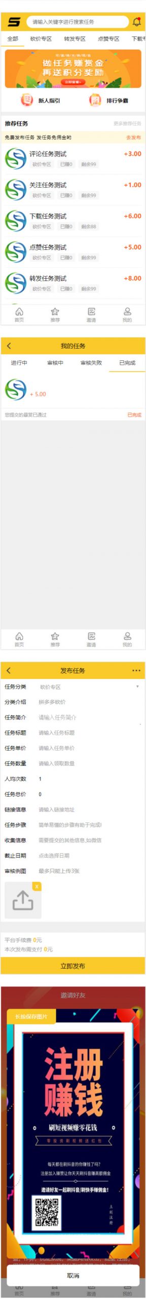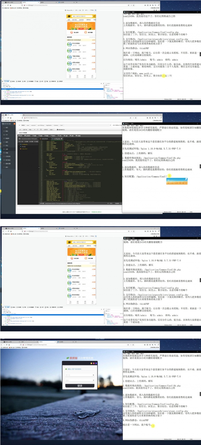 这个是带有用户发布任务功能的,还有信用分评分什么的,挺全面,具体的大家搭建出来看一下就知道。都是OK的。支付对接第三方个人免签,微信支付宝双通道,也挺舒服。去授权版本,第一次打开后台会提示未授权,重新进一下就OK了,源码已经整理完毕,跟着教程搭建就OK。