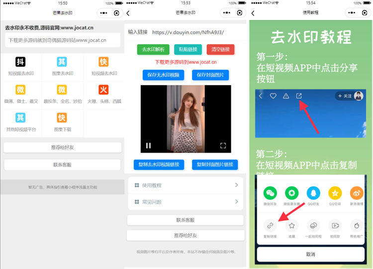 这是一款支持多种平台去水印的一款微信小程序源码,支持短视频去水印,还有图集去水印等