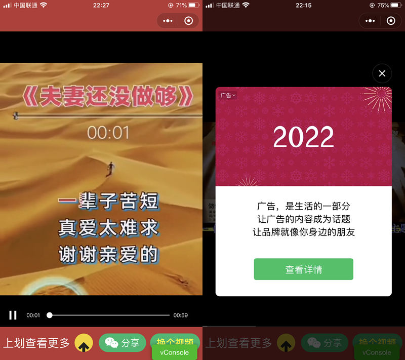 这是一款特别受老年人喜欢的一款小程序内的视频内容都是老年人喜爱的,也是喜欢转发的,另外该小程序的插屏广告还是定时出现的哟,如此达到高收益,另外用户支持点击跳转下一条视频,或者下拉刷新,总得来说其实没有什么好介绍的,也就是视频播放而已,不多说,直接上图大家看效果,视频都是秒播的哟!
