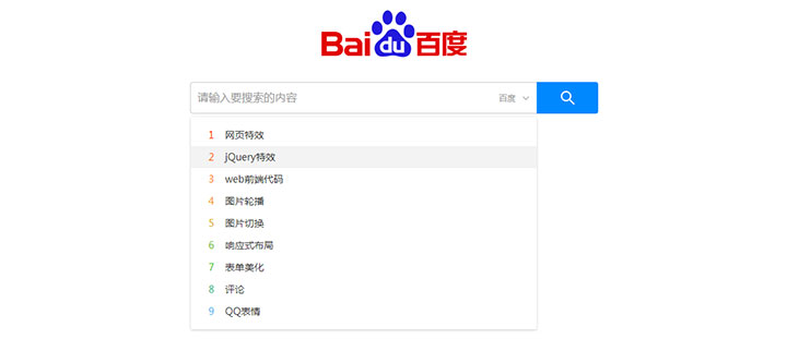 jQuery仿百度搜索框下拉热门关键词列表代码,点击搜索框弹出下拉热门关键词列表,点击关键词进行快捷搜索。