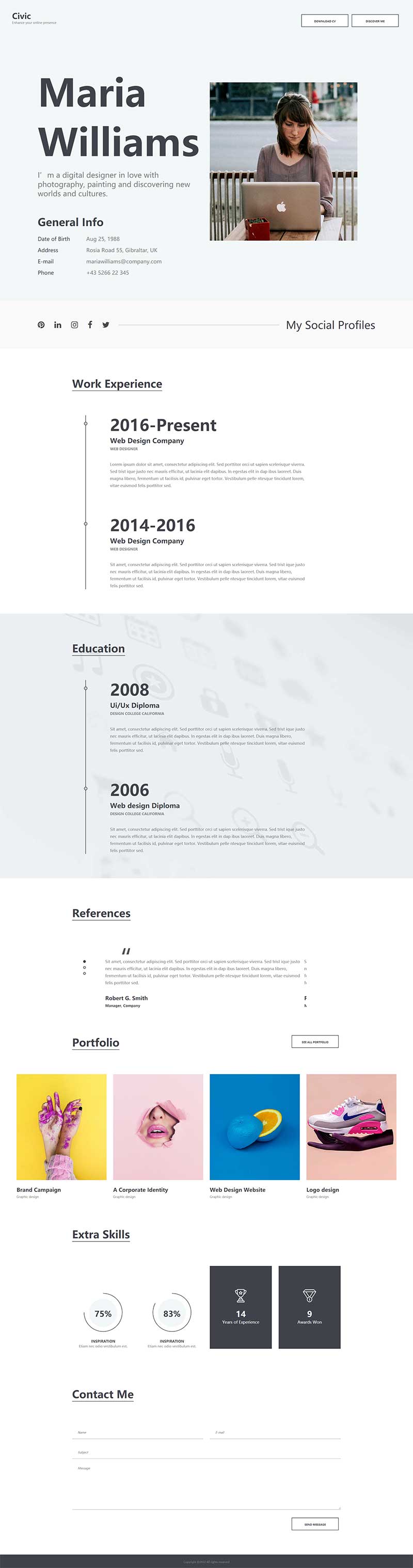 这是一组HTML白色简约个人简历web模板,共包含6个html主页页面供您任意选择,每一款页面的宗旨都是精简干净,喜欢的小伙伴不要错过,100充分响应易编辑。