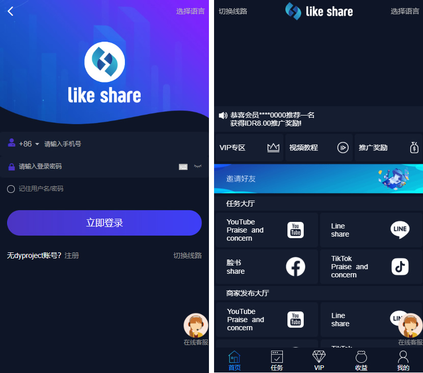 前几天还有会员跟我要国际抖音点赞源码,今天就给大家带来了。国际多语言版抖音+快手+脸书+LINE+TIKTOK悬赏平台