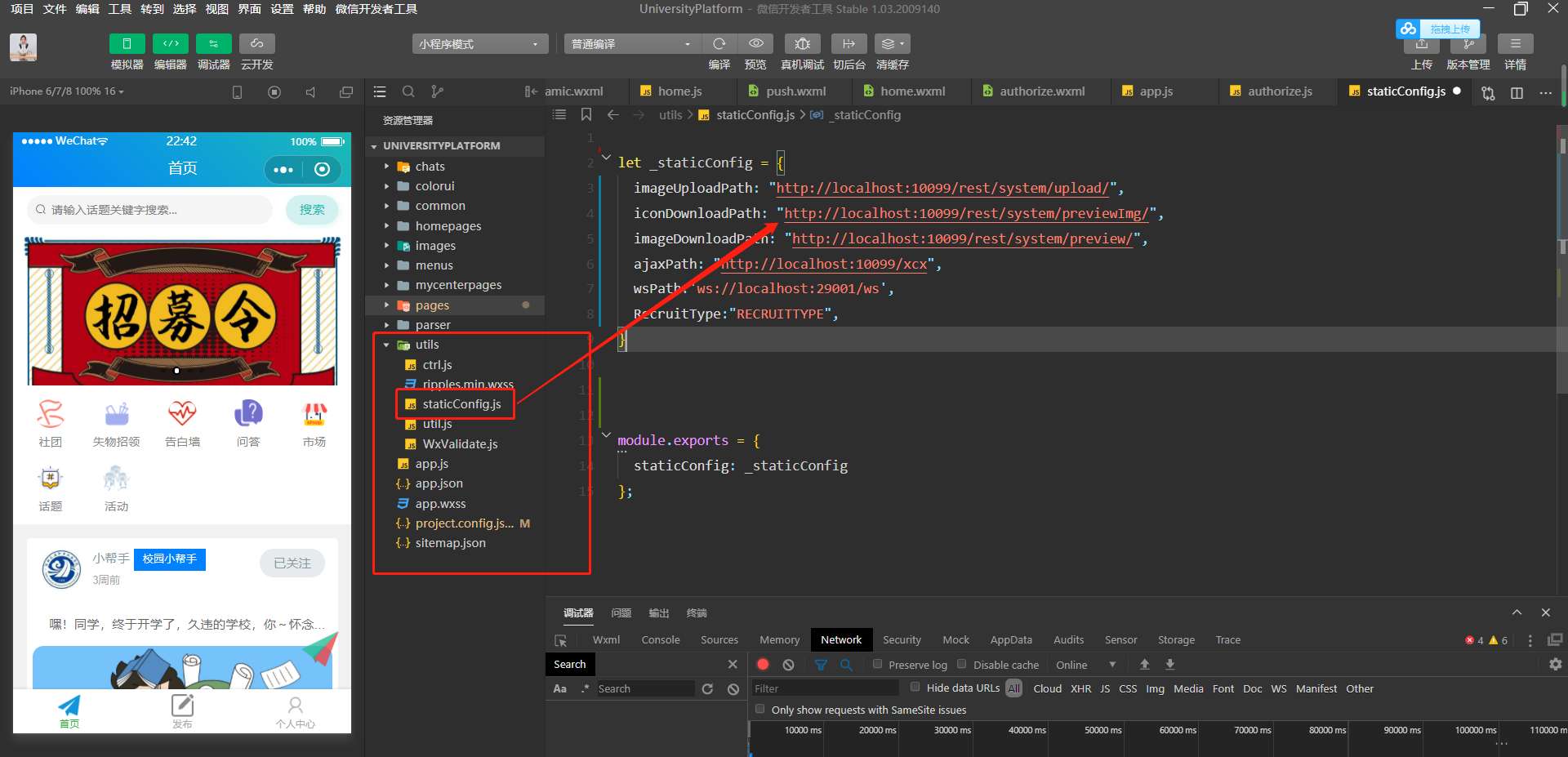 用微信开发者工具打开小程序项目,找到utils下的staticConfig.js 修改 http://localhost为 https://自己的域名。如图7所示: