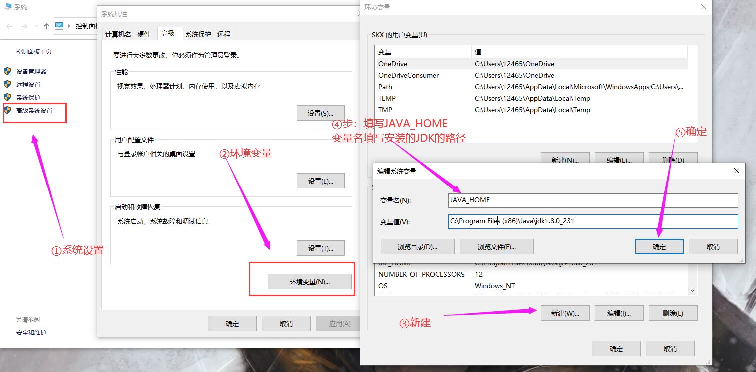 变量名称填写:JAVA_HOME, 变量值填写(自己的)刚刚安装的JDK路径:C:\Program Files (x86)\Java\jdk1.8.0_231 点击确定