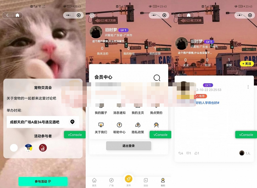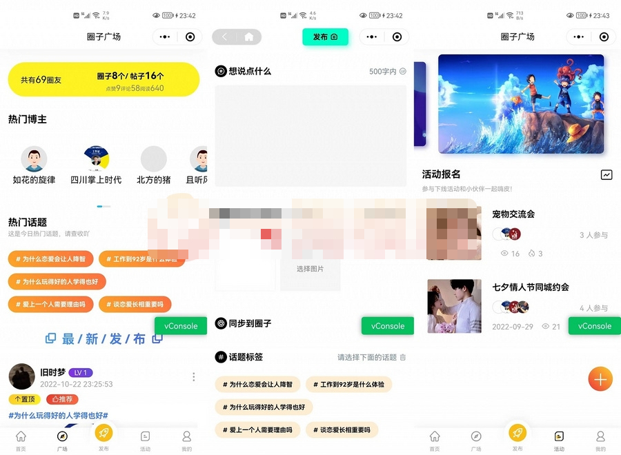 小程序授权登陆,H5和APP,手机号登陆,发帖,建圈子、发活动。