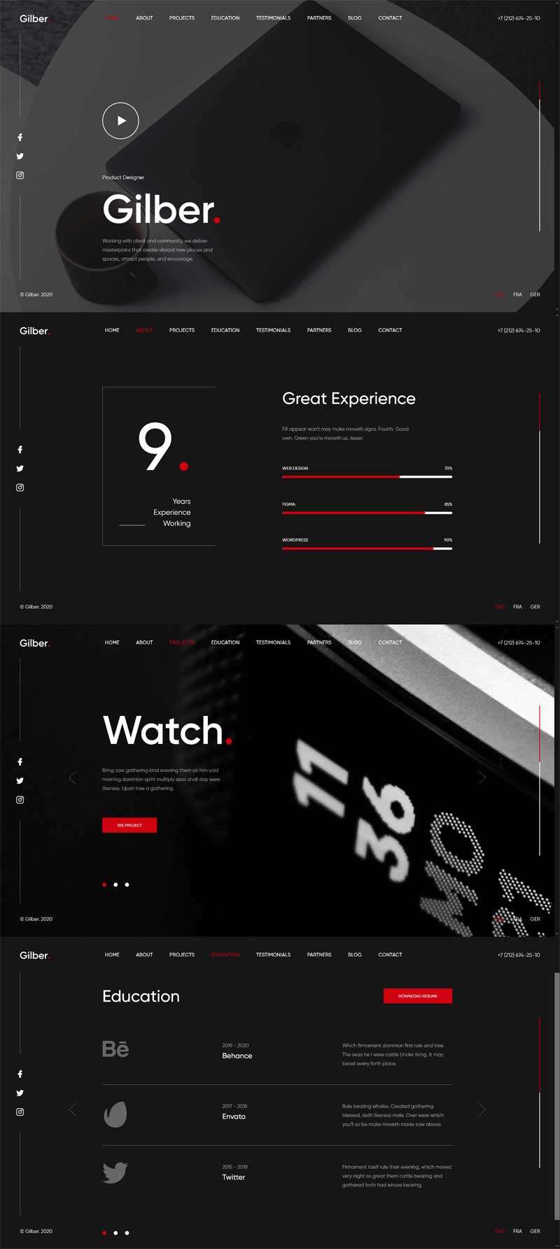 一套黑色酷炫个人主页简历、设计师作品展示、软件开发人员、自由职业者,项目案例展示网站HTML5模板。代码组织良好和合适的命名,这样你就可以轻松地自定义。