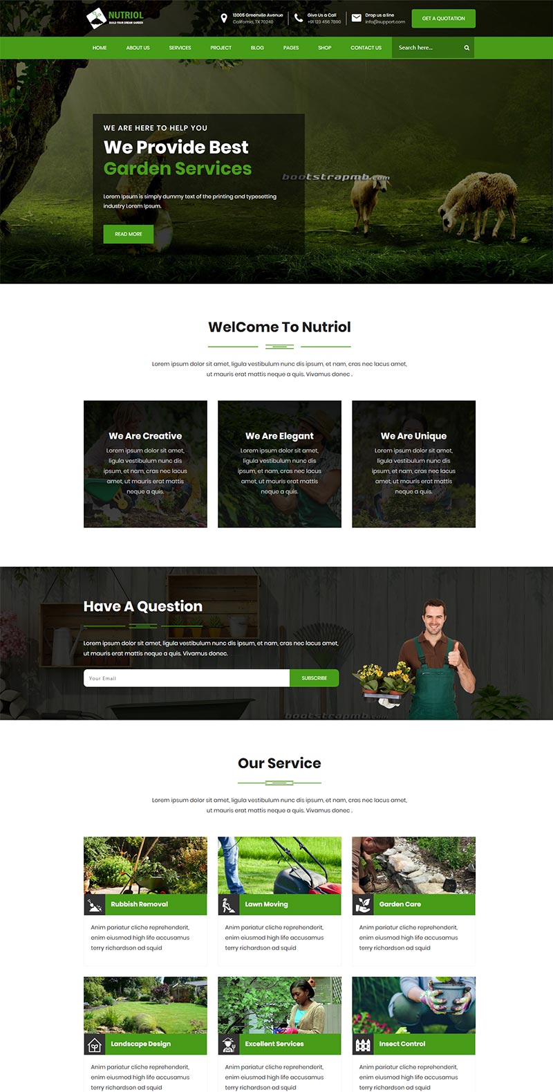 基于Bootstrap构建,绿色的花园和景观服务HTML5响应式模板,适合草坪服务业务,绿化公司,园丁,景观建筑师,园艺业务,花店,、鲜花、生态、景观、商业、农业提供相关服务的公司网站模板。