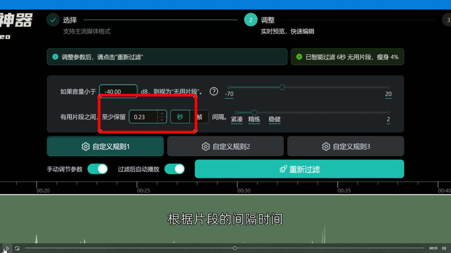 如果感觉默认的3种间隔设置不合适,打开 手动调节参数,调节过滤的音量,跟片段的间隔,我这边设置0.1秒,点重新过滤,发现过滤了15秒。使用紧凑过滤,点击 导出,选择 过滤后音频,重新生成文件会自动添加autocut,看一下时长,剪辑后为1分58秒,原音频为2:30秒,瘦身22%。