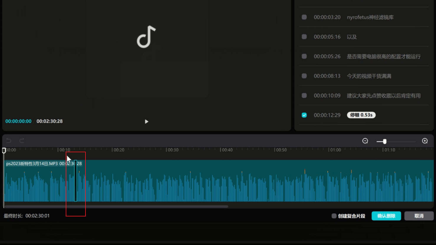 有人说剪映也有这个功能呀,我用同一个音频测试,可以发现剪映的智能剪口播,只识别出了一个间隔,功能基本等于没有。
