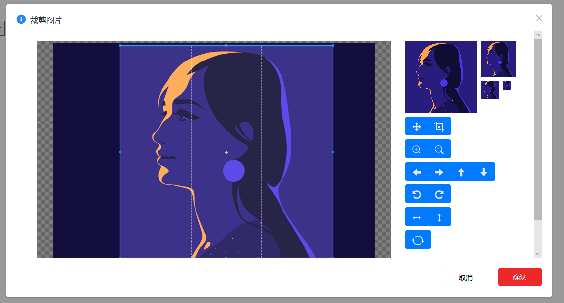 jQuery头像图片裁剪尺寸插件,点击“裁剪图片”按钮弹出裁剪功能窗口,支持移动图像、裁剪图片、放大缩小、上下左右移动、翻转、重置等功能。