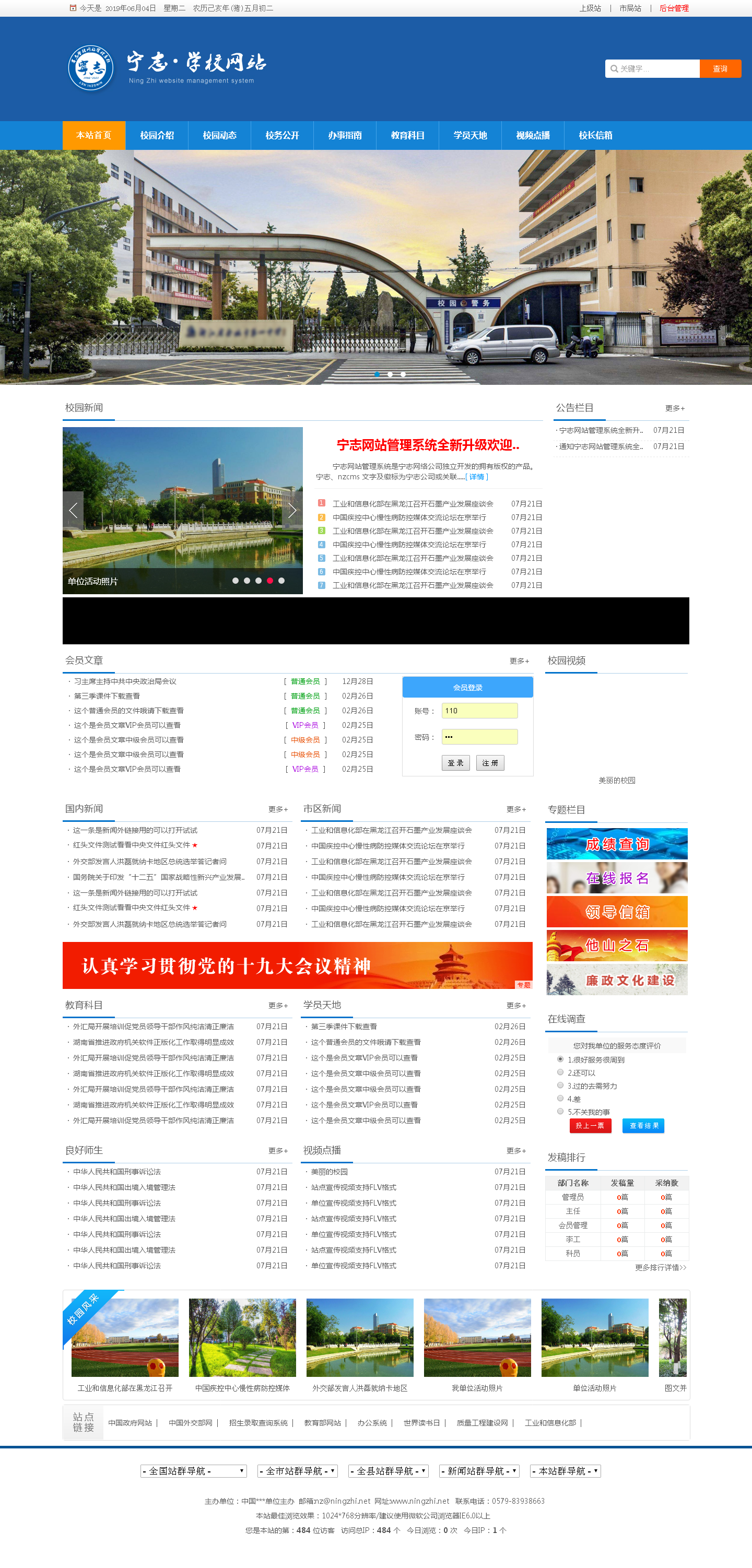 宁志天蓝色中小学校网站管理系统+会员 宽屏版是一套专为学校/教育建站首选的信息网站管理系统,天蓝色风格宽频页面十分大方。