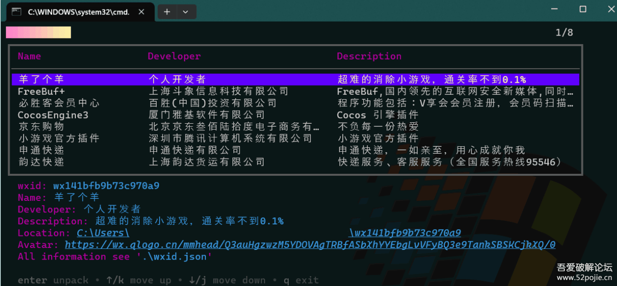 使用键盘上下键选中想要处理的小程序,然后按回车来执行解密+解包