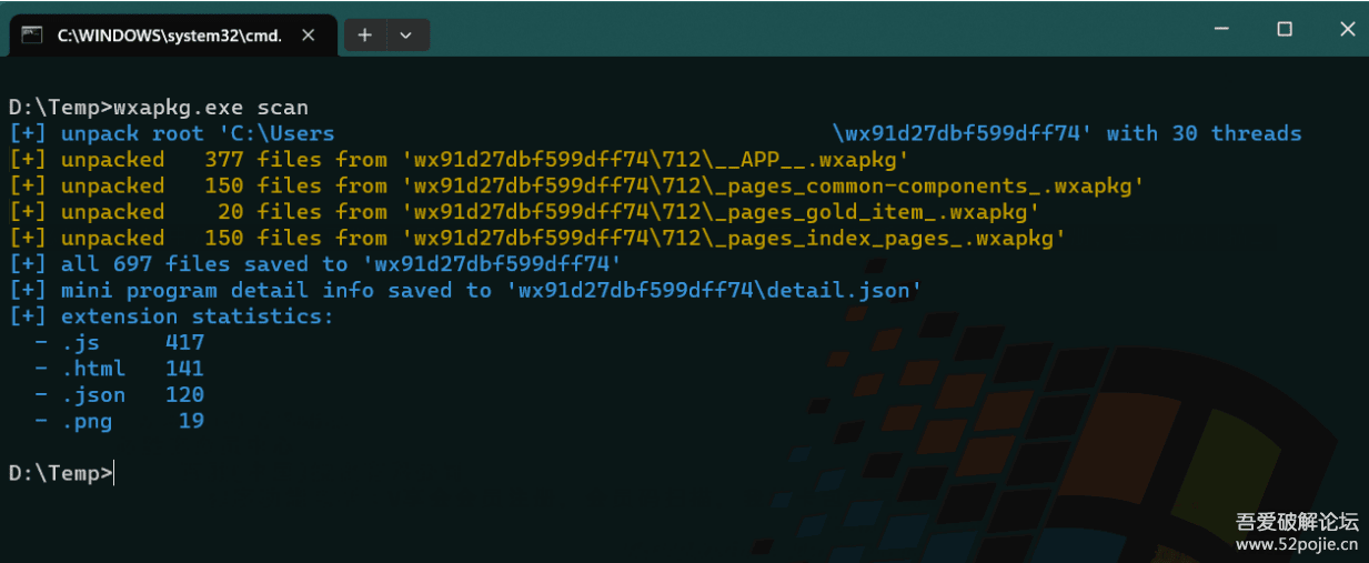 使用 wxapkg.exe scan 命令来扫描所有小程序。需要联网获取小程序的名称、路径、wxid(用于后续解密)等信息