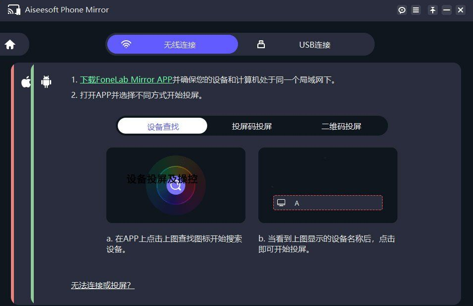 对于 Android 用户,您可以通过 WiFi 或 USB 数据线将 Android 设备镜像到 PC。
