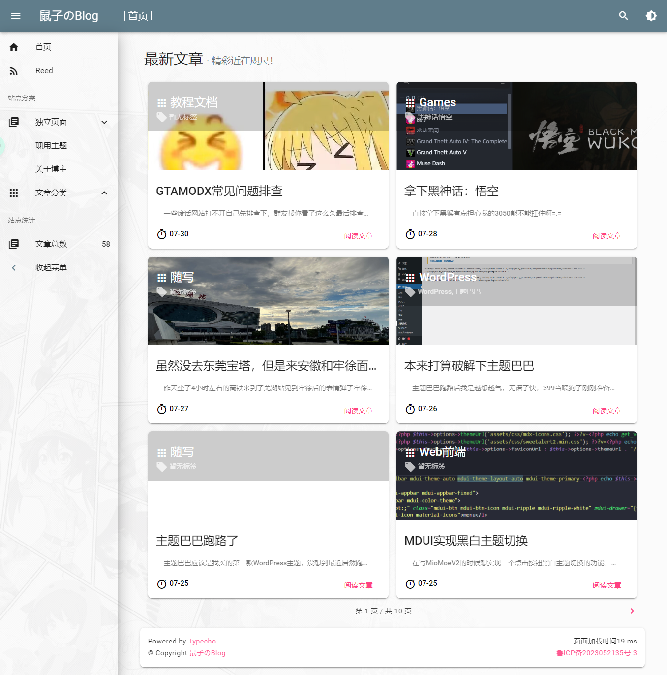 MioMoeV2重构版 基于MDUI的轻量化Typecho博客主题,本主题适合开发者使用,对于有动手能力的童鞋来说二开如喝水。当前版本:Beta 1.4 测试版