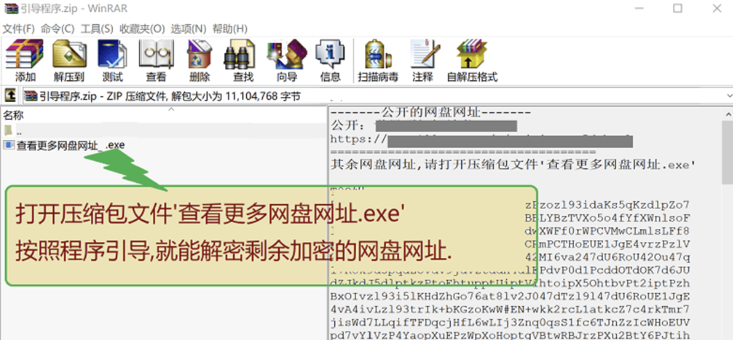 压缩zip文件时,附带打包解密引导程序,按照解密程序引导,无须解密密码就能自动解密加密的网盘网址。