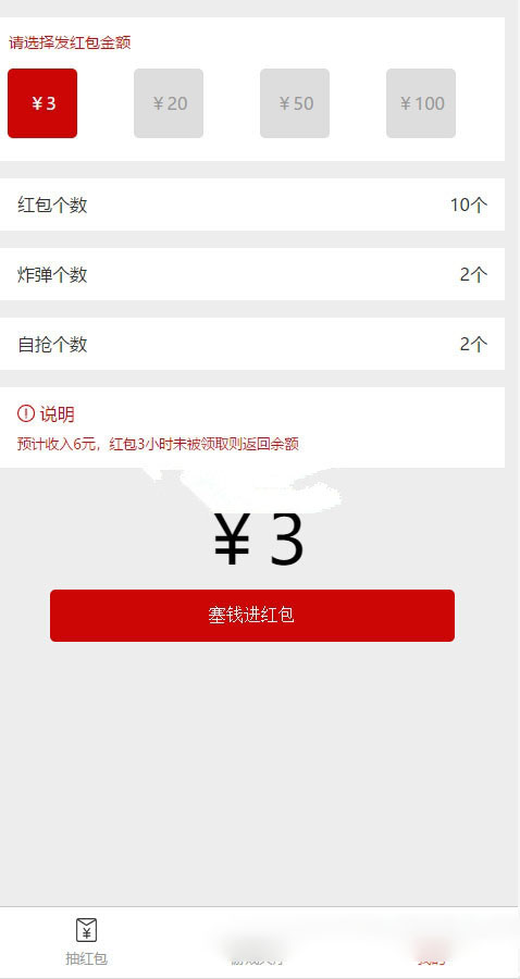 一,发对应金额的红包随机分配成10个真红包及两个炸弹,炸弹金额与所发红包金额一致