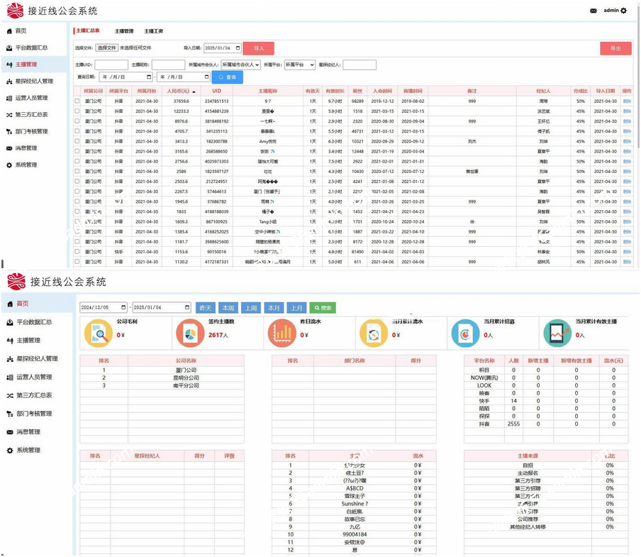 工会系统抖音快手等多平台主播分红分润系统,星探经纪人城市合伙人多角色管理系统分红统计系统。