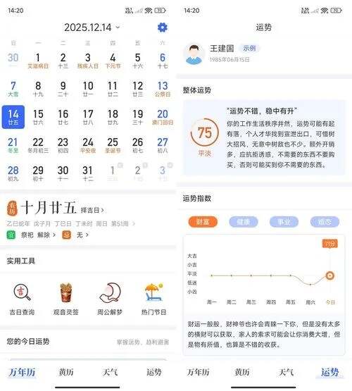 天天老黄历是一款集日历、黄历、天气等于一体的实用软件。它界面简洁,具浓厚中国风,可查公农历、黄历宜忌、吉神凶煞等,还有算命、周公解梦等功能,且无广告干扰,方便快捷。
