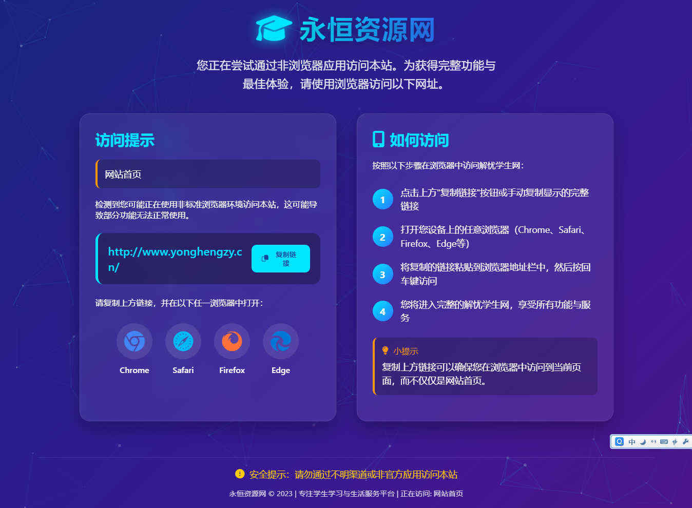 采用动态拦截技术,获取拦截前用户访问的网址,并且传参到拦截页面,可以做到用户通过什么子链接访问网站,只要是微信QQ访问,均会重定向到拦截网页,并显示复制链接到浏览器打开访问,且复制的链接采用动态获取拦截前用户访问的原网址。下面是测试图片。开箱即用。