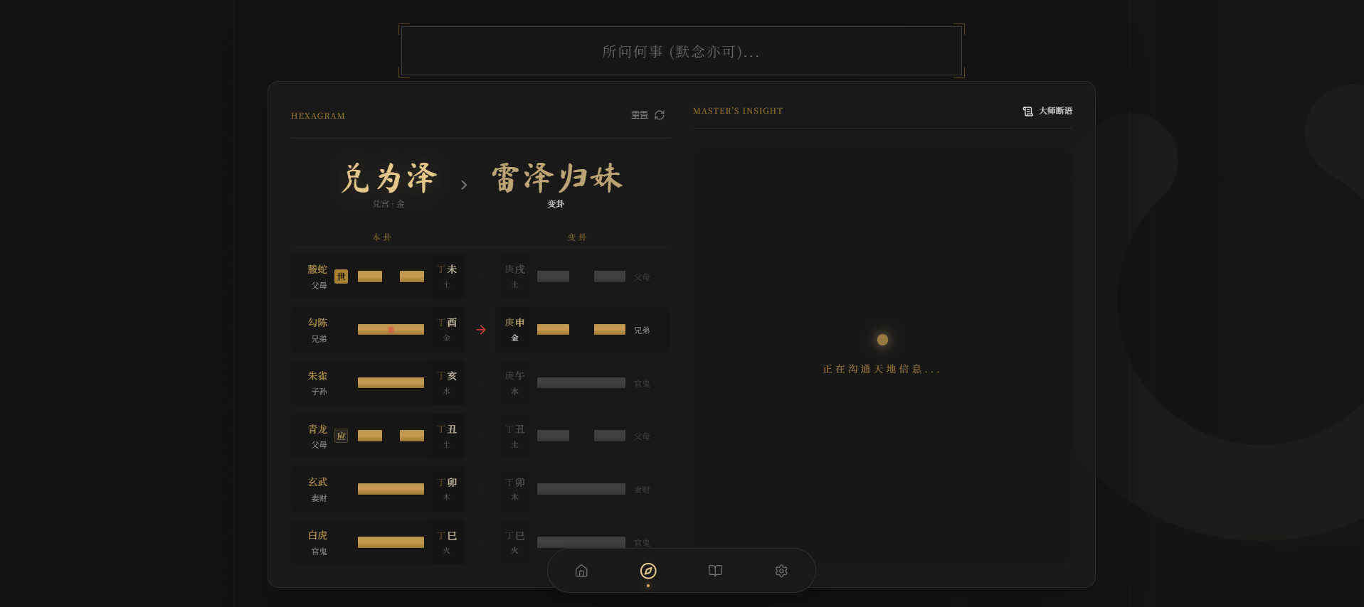 功能完整:支持手动指定卦式、时间自动排盘,涵盖感情/事业/财运等占问事项,展示本卦、变卦、六亲、伏神等信息;