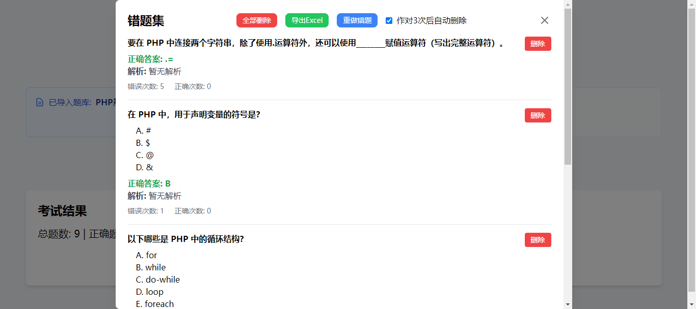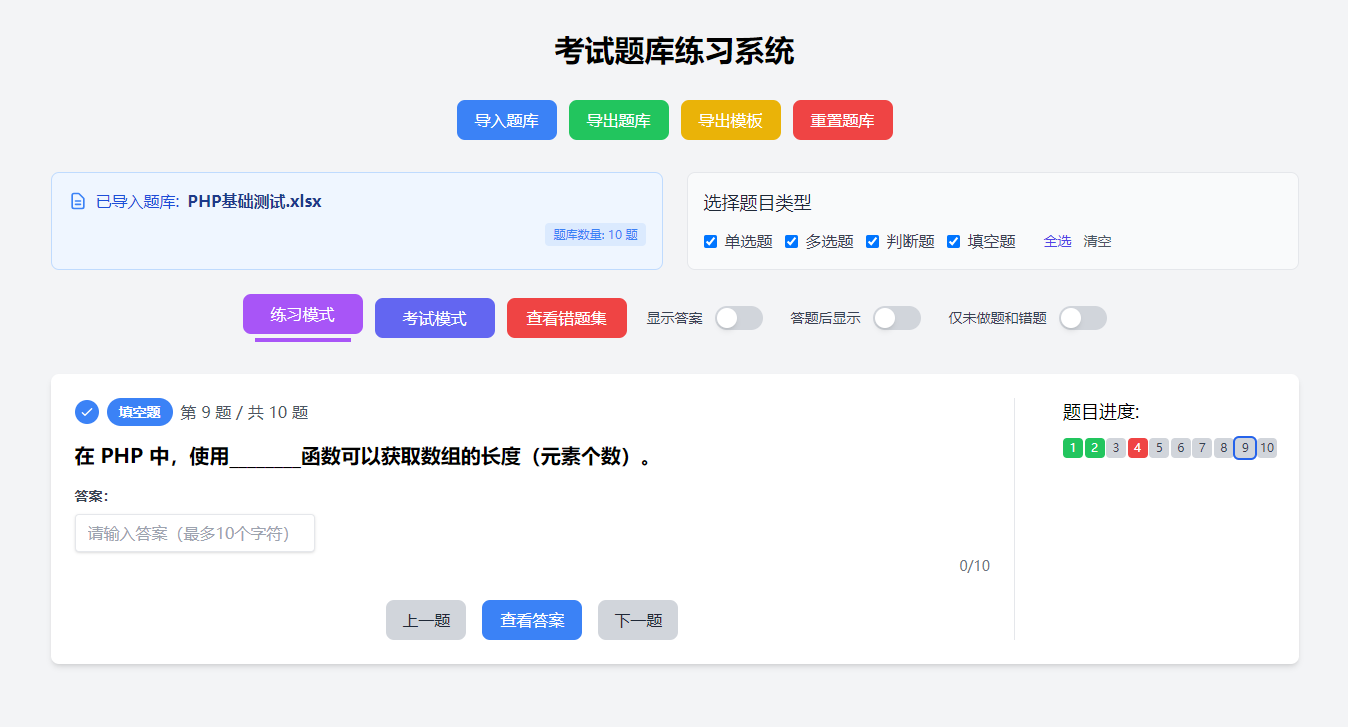 自定义题库,题库格式按表格模板填写,支持练习模式/考试模式/查看考试错题集