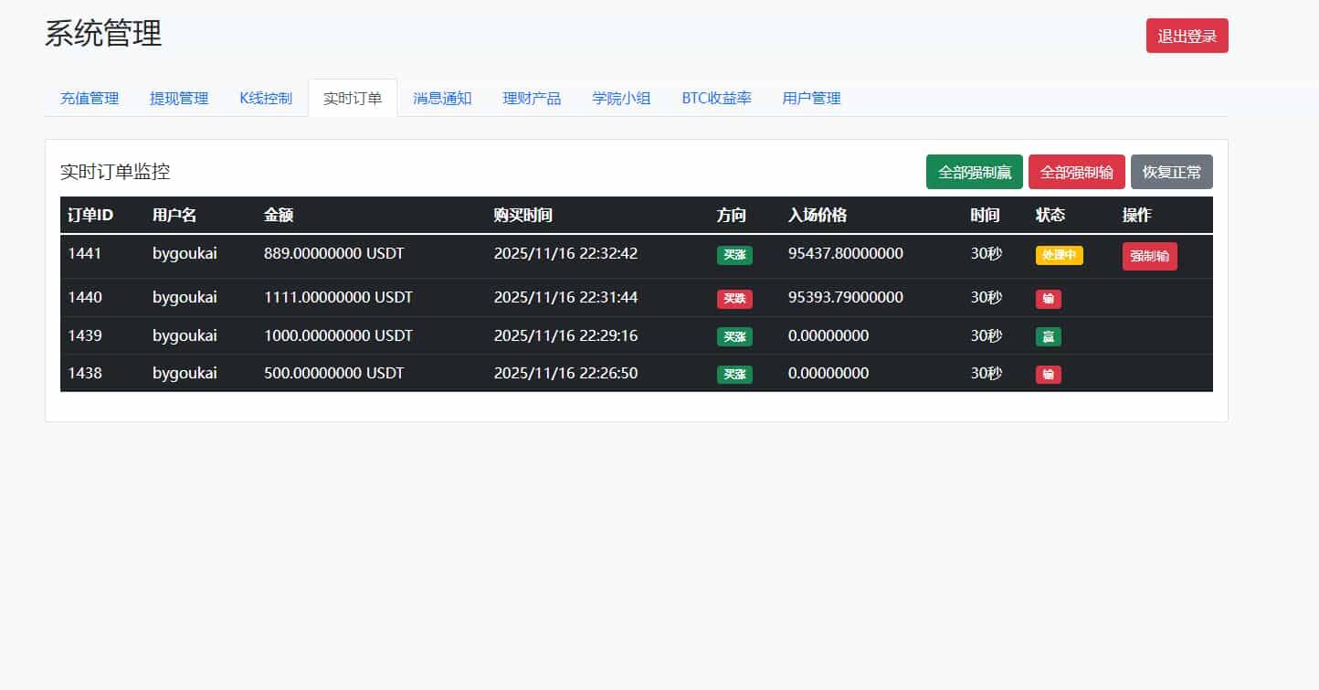 主要测试了k线行情控制、用户输赢控制、订单输赢控制,非常好用,各个功能都正常,还有代理功能