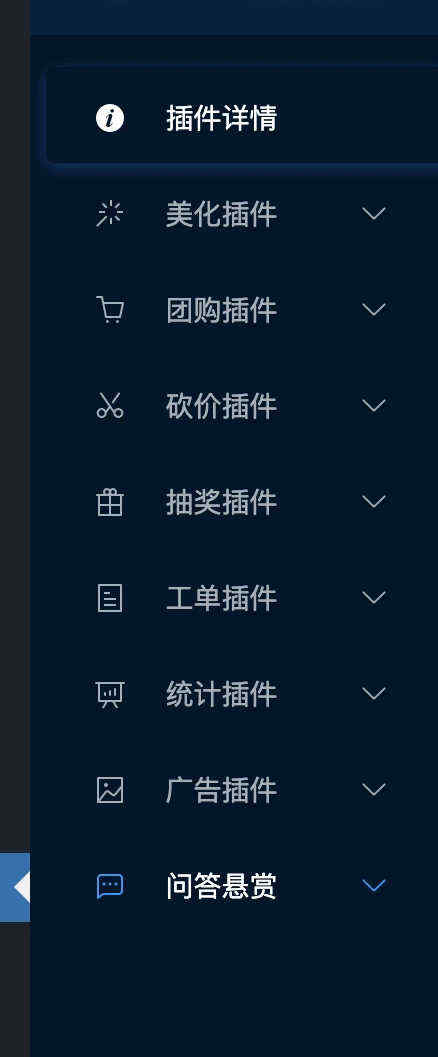 功能范围:美化插件、团购插件、砍价插件、抽奖插件、工单插件、统计插件、广告插件、悬赏插件