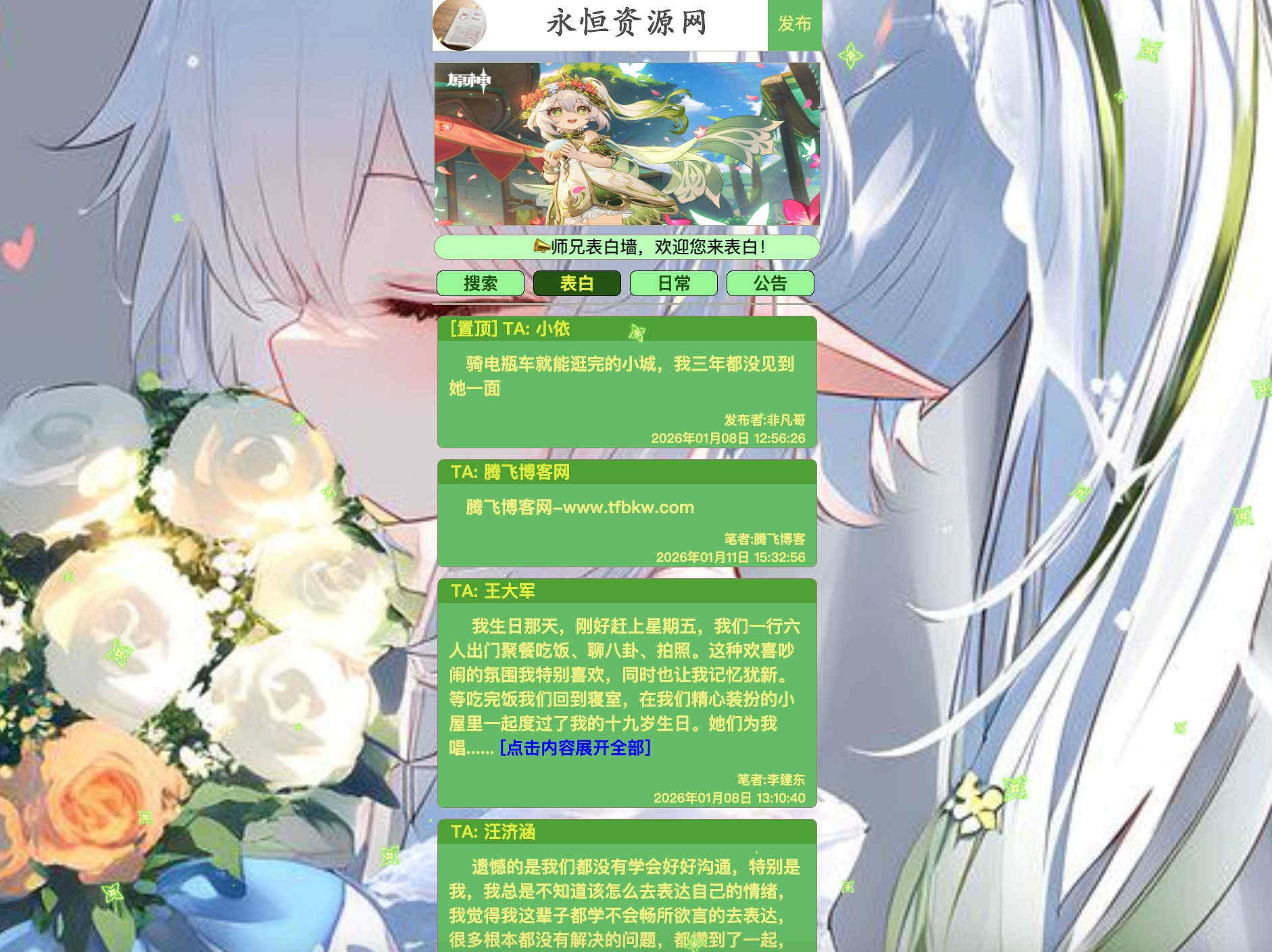 这是一款很老式的校园恋爱爱情表白墙源码,这款源码给大家简单的测试了,功能正常使用,不过UI是老还是就是这样的美观,喜欢的自行部署吧!