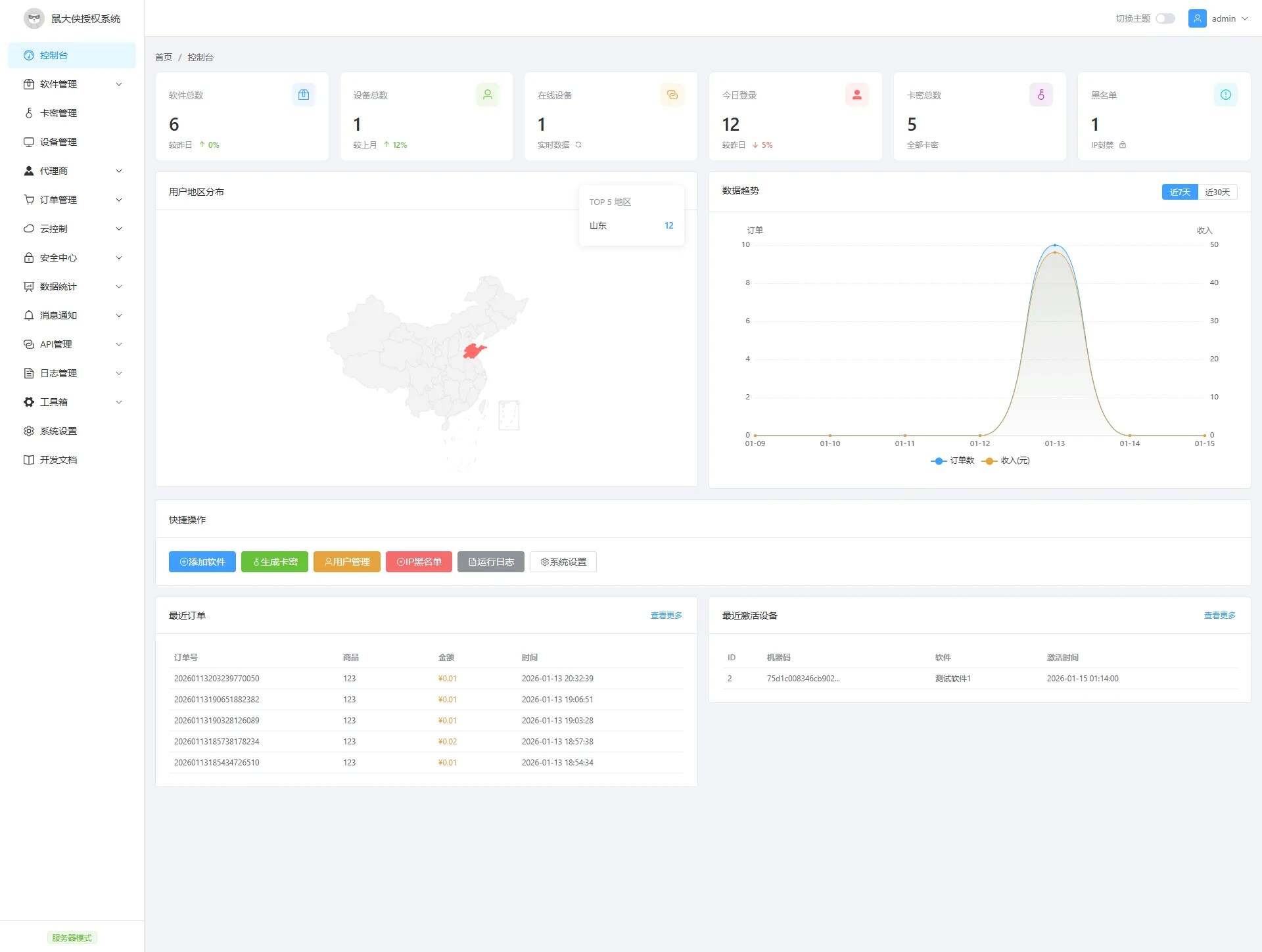数据统计:控制台实时展示软件数、设备数、在线数、今日登录等数据