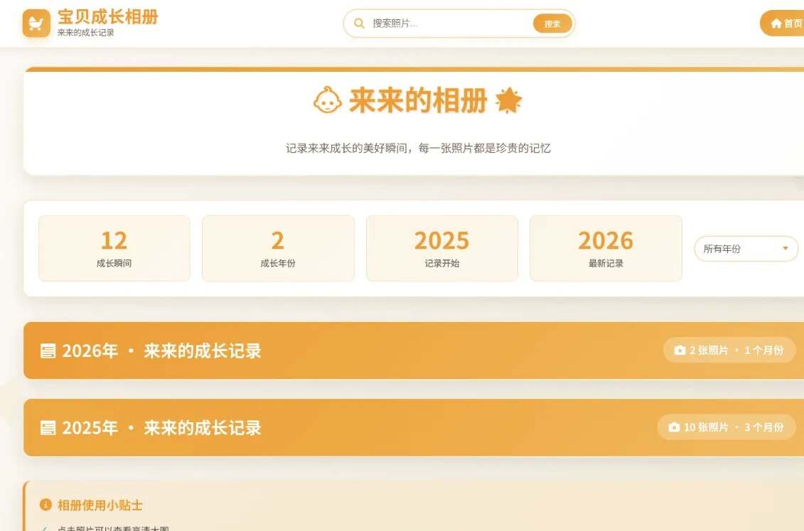 它不仅仅是一个相册,更是一个 「时间胶囊」。每次打开,都能按年份、月份自动归类,还能计算孩子的年龄,记录他/她成长的每一步。