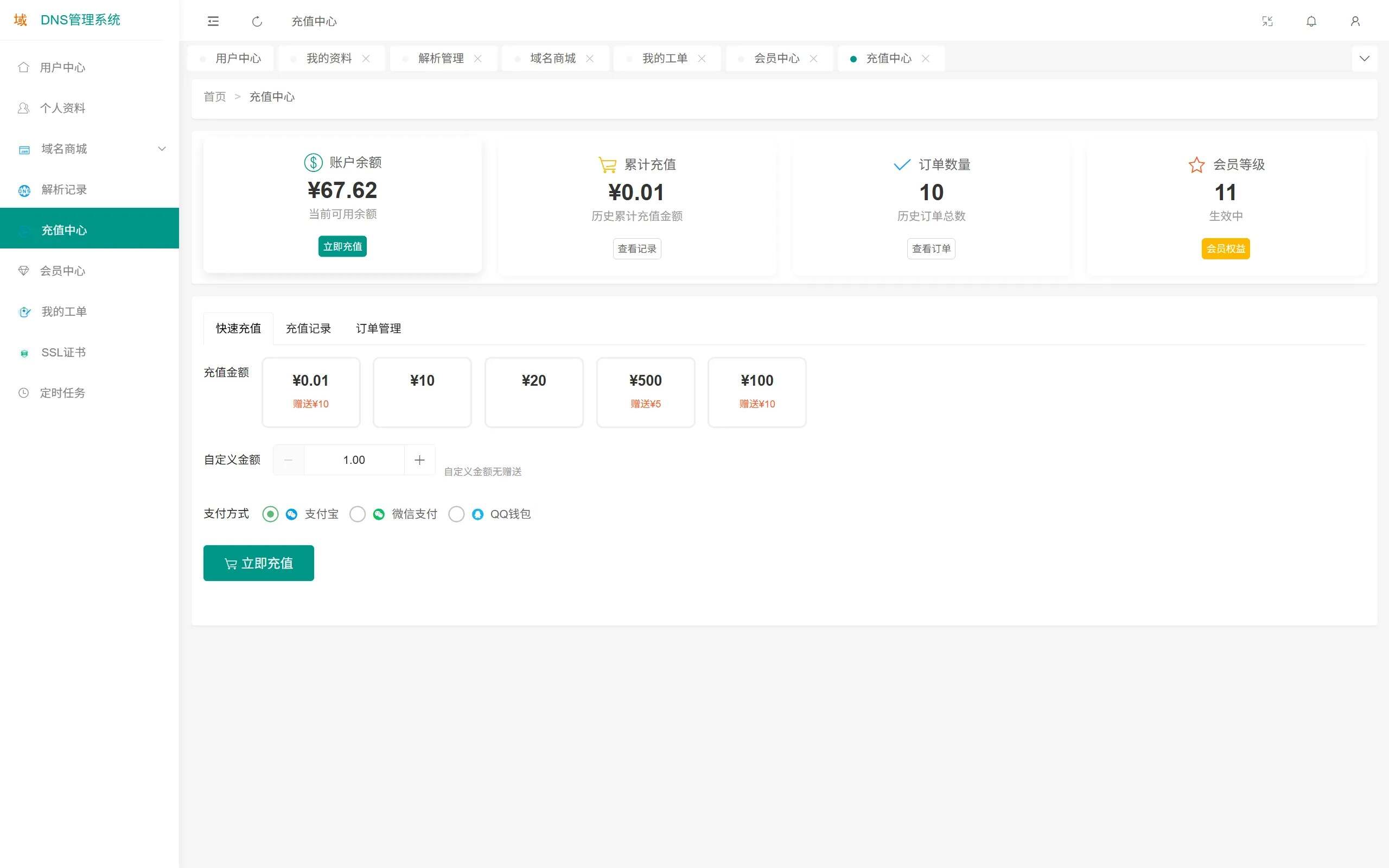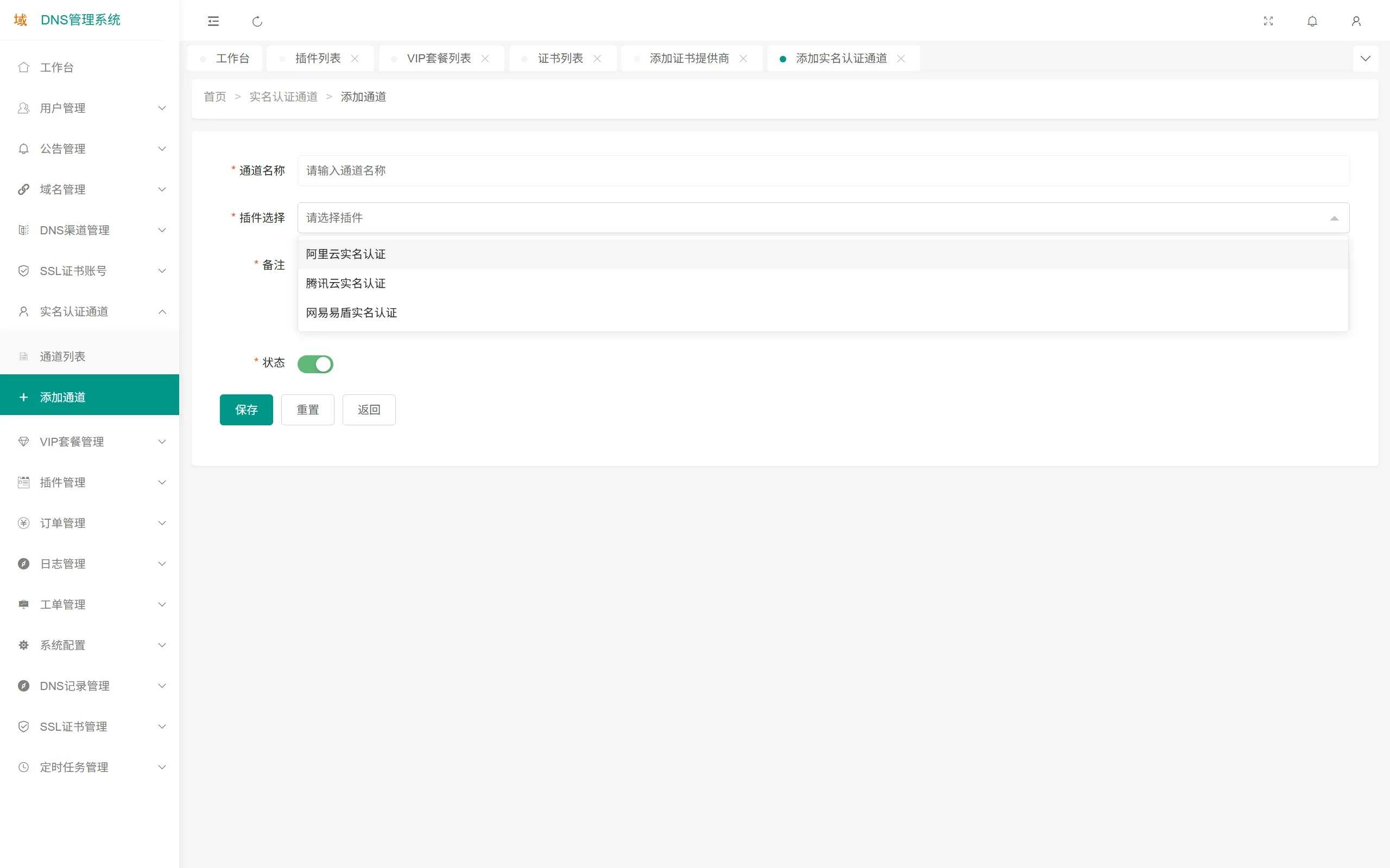 第六步:依次配置DNS渠道、会员套餐、用户管理、实名认证通道、SSL证书商、域名管理…等相关功能配置