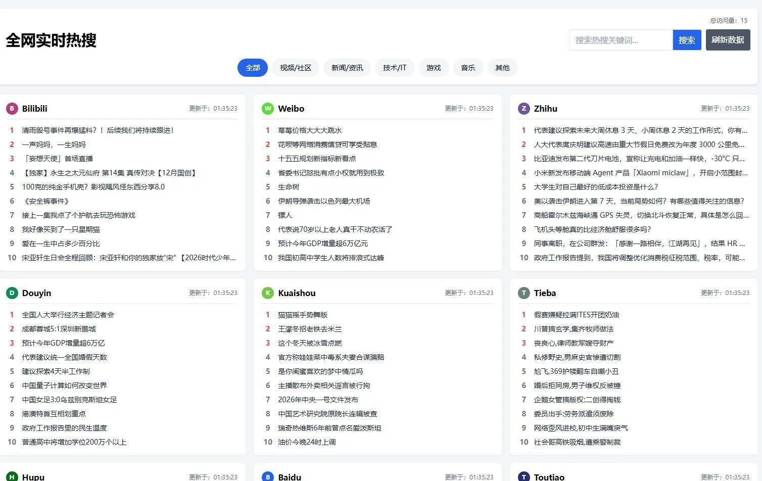 这是一款无需数据库、开箱即用的PHP全网热搜聚合源码,集成多平台热搜、分类筛选、搜索、天气预报与访问统计,采用缓存机制优化性能,响应式布局适配所有设备,适合快速搭建实用美观的实时热搜导航站。
