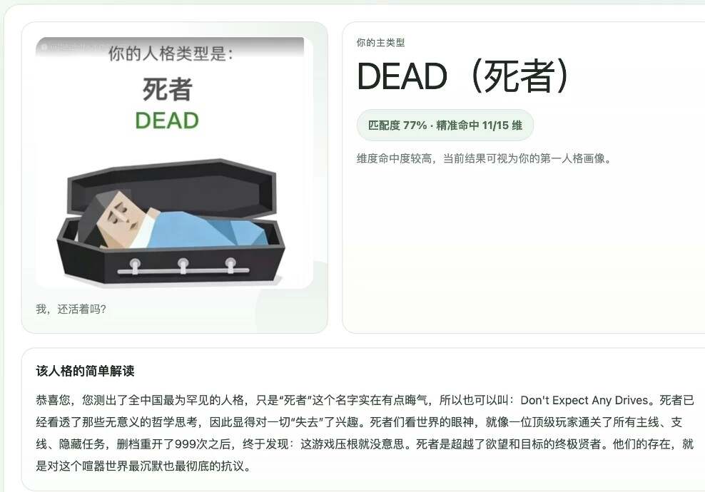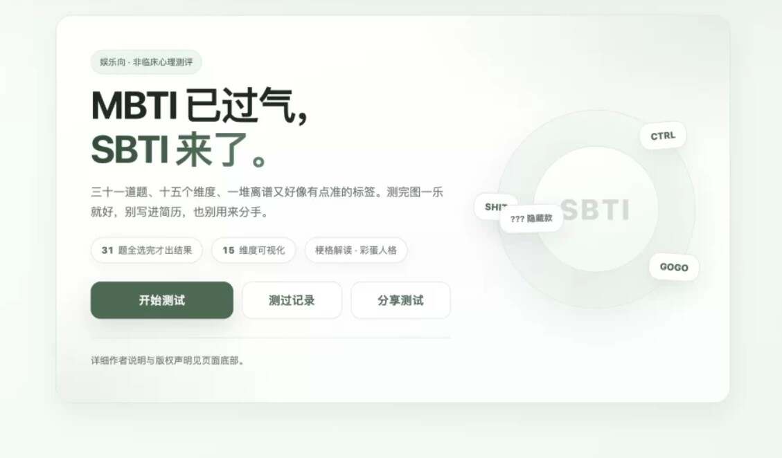 这是一款最近比较火的SBTI人格测试源码,可以去做题选出来自己的人格,比如小丑、尤物,还是比较不错的,源码很简单,上传服务器访问域名即可,喜欢的自行部署吧!