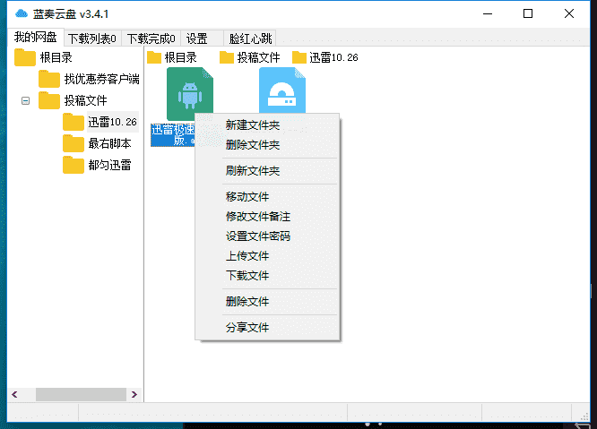 支持上传任意文件,下载文件、下载分享的文件夹、文件、其他可下载的URL,断点续传、历史记录等