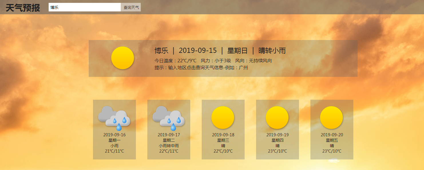 百度API全国城市地区天气查询HTML源码源码直接上传即可使用,支持上传二级目录访问,输入地区即可查询最新天气预报(如;广州)