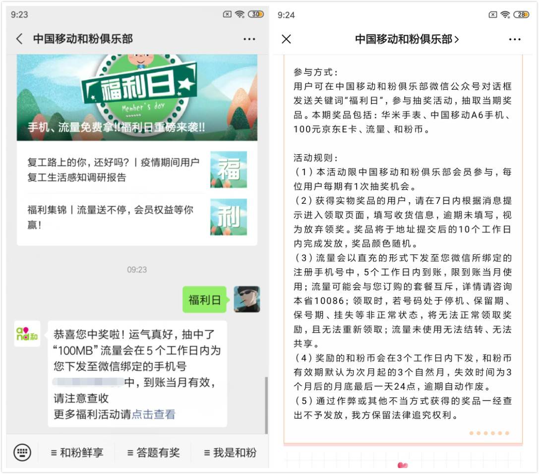 微信关注“中国移动和粉俱乐部”->发送->福利日->中了流量5天内到