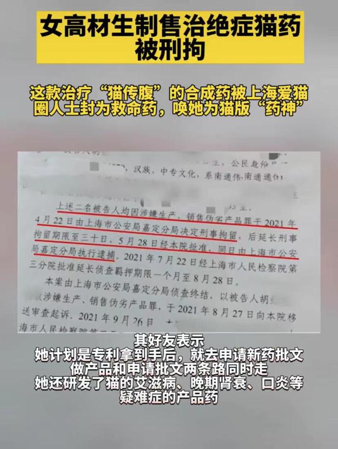 2019年,女高材生胡某艳改良可治“猫传腹”病的化合物分子式,此后尝试申请兽药审批。但在没有获得批准的情况下,将对猫无危害的该化学物质,作为添加剂,加在已经取得合法生产批文的另一款兽药中进行生产。在查获之前,该药已经销售了一千多万元。