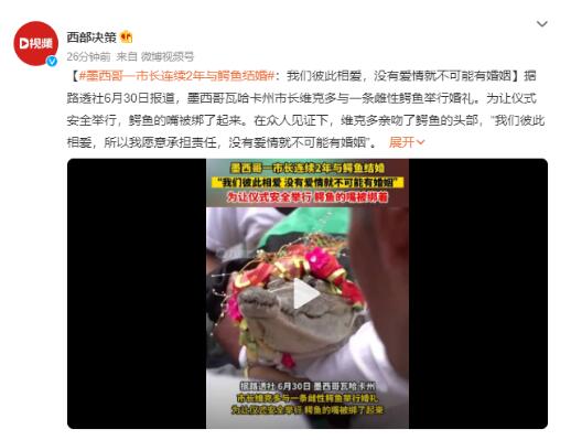 据路透社6月30日报道,墨西哥瓦哈卡州市长维克多与一条雌性鳄鱼举行婚礼。为让仪式安全举行,鳄鱼的嘴被绑了起来。在众人见证下,维克多亲吻了鳄鱼的头部,“我们彼此相爱,所以我愿意承担责任,没有爱情就不可能有婚姻”。据了解,这不是他第一次与鳄鱼“结婚”,去年6月,他曾与一条雌性鳄鱼举行过同样仪式,尚不清楚这两条鳄鱼是否是同一条。据报道,这一仪式在当地已存在230年,以表示琼塔尔和瓦韦土著群体间的友好,维克多代表的是琼塔尔领袖,鳄鱼象征着瓦韦族群里受人尊敬的“公主”。