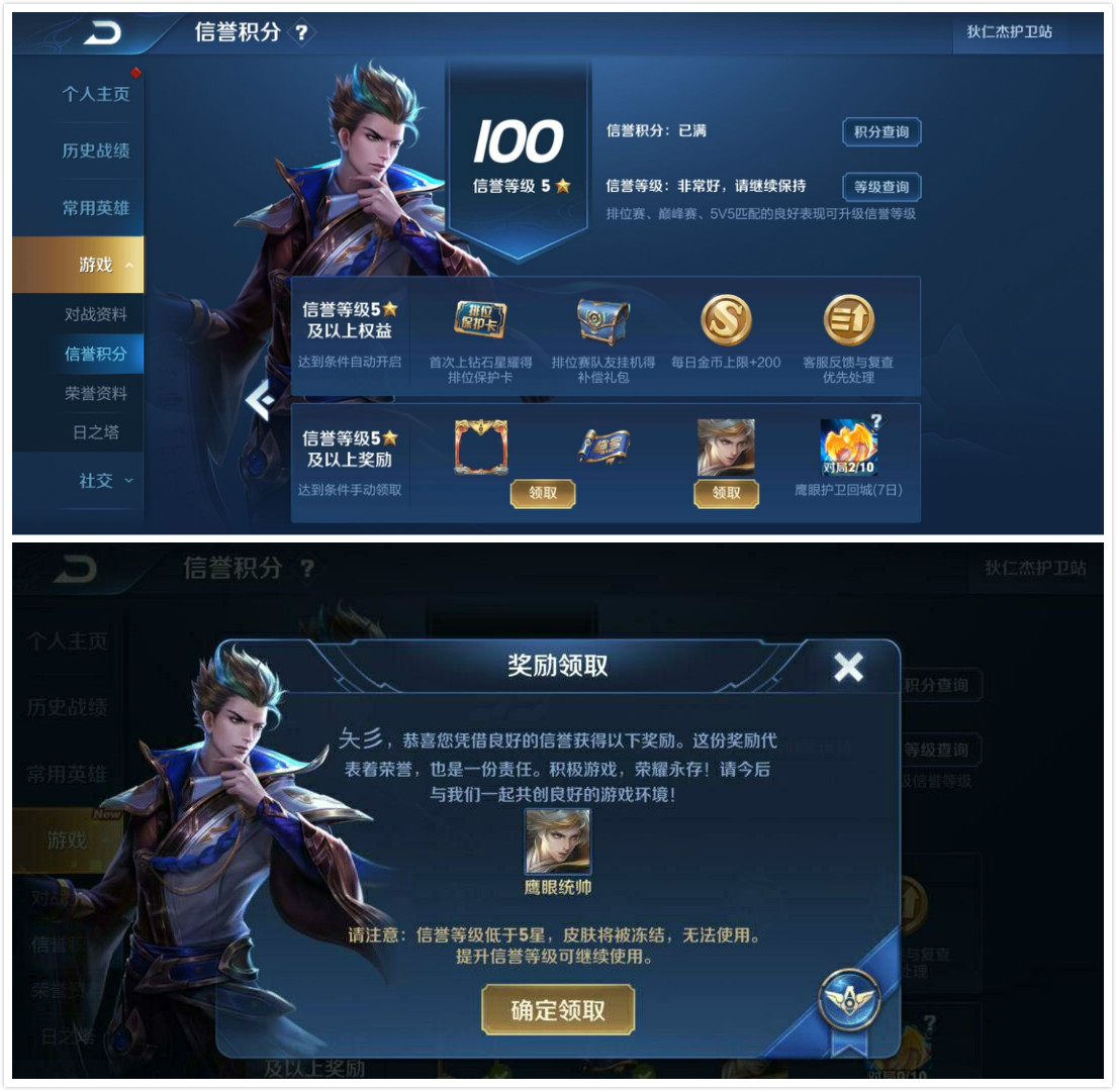 打开王者荣耀->点击左上角头像->游戏->信誉积分(得够5星)->点击领取即可