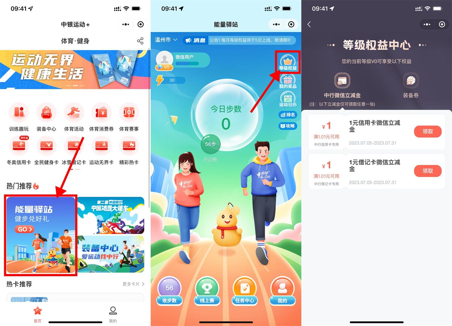 微信进入小程序“中银运动+”->能量驿站健步兑好礼->右上角“等级权益”->直接领取1元微信立减金